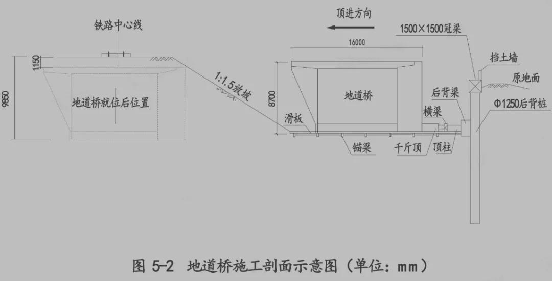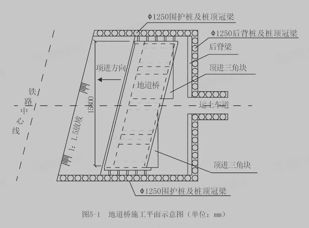 某公司承建一项城市主干路工程,长度24km,在桩号K1+180-K1+196位置与铁路斜交,采用四踣地道桥顶进下穿铁路的方案。为保证铁路正常通行,施工前由铁路管理部门对铁路线进行加固。顶进工作坑顶进面采用放坡加网喷混凝土方式支护,其余三面采用钻孔灌注柱加桩间网喷支护,施工平面及剖面图如图5-1、5-2所示。