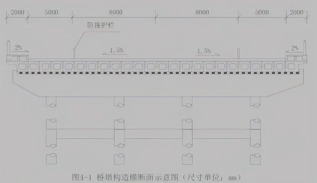 某公司承建一座城市桥梁工程,双向四车道,桥跨布置为4联x(5x20m),上部结构为预应力混凝土空心板,横断面布置空心板共24片,桥墩构造橫断面如图4-1所示。空心板中板的预应力钢绞线设计有N1、N2两种型式,均由同规格的单根钢绞线索组成,空心板中板构造及钢绞线索布置如图42所示。